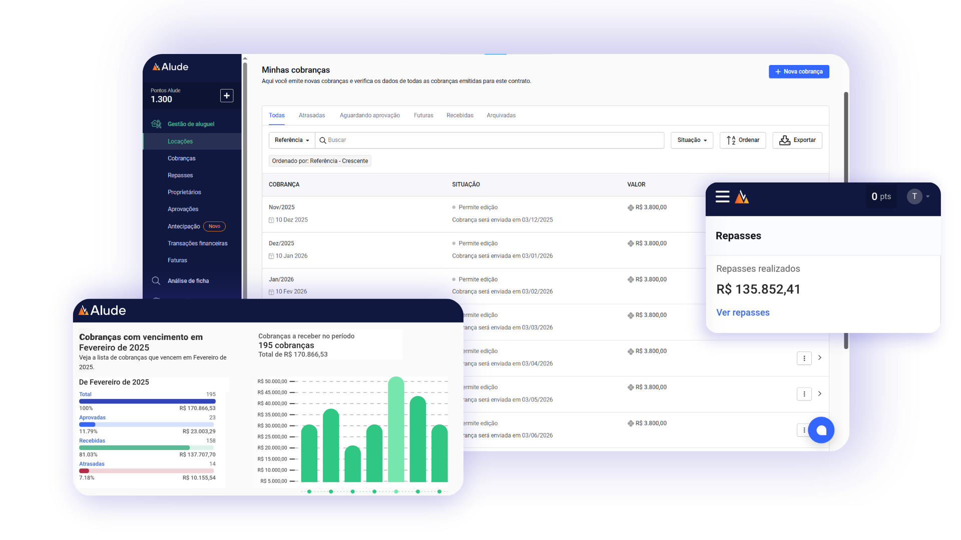 Com a Alude você automatiza cobranças, conciliações financeiras, repasses, reajustes e comunicações, tudo em um só lugar. Você cadastra o imóvel, o inquilino e o proprietário, e o sistema faz o resto.